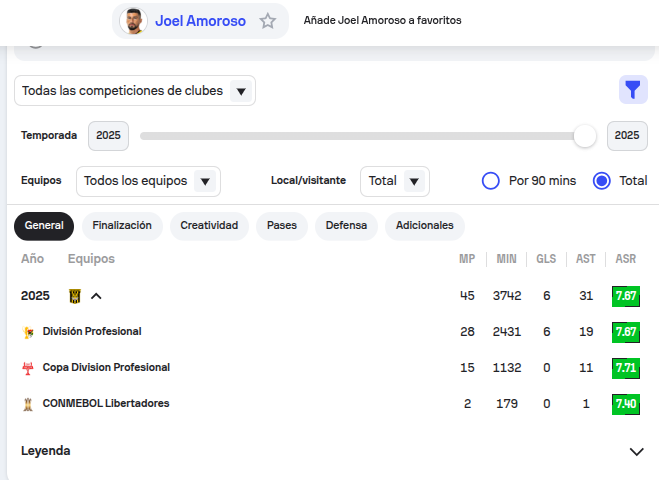 «Desde SofaScore le cuentan unas 31 asistencias a Joel Amoroso en el 2025.»