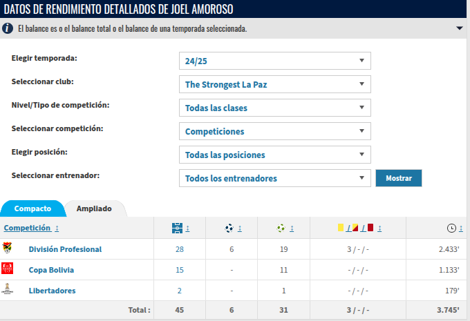 @django-galeano Eso es lo que me extraña, porque la Copa Bolivia es oficial, hasta da cupo para la Libertadores, y en Transfermarkt le cuentan esas asistencias. Si no lo están contando a Amoroso no le encuentro la vuelta.