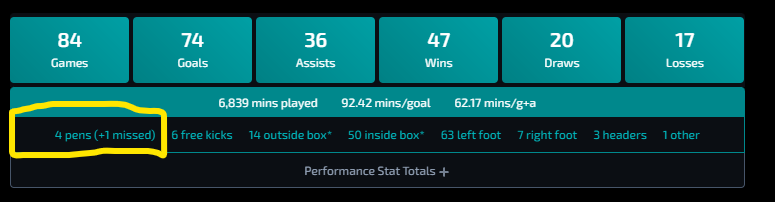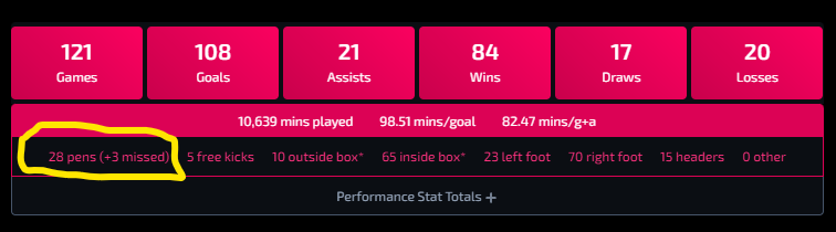 – El único jugador con más de 200 penaltis lanzados.