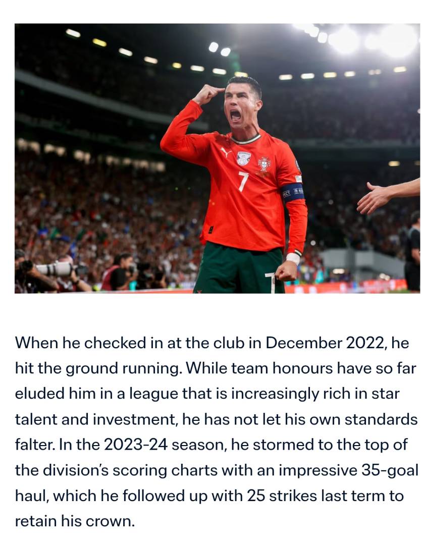 Y en el mismo párrafo mencionan los 35 y los 25 goles ligueros de CR7 las pasadas campañas. No hablan en ningún momento del resto de torneos.