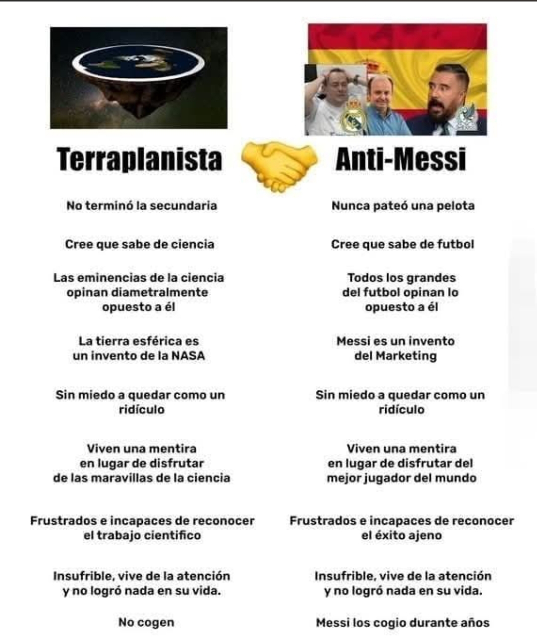 Bien a sabiendas de lo ridícula que es de fondo la postura terraplanista, los mejores argumentos de dicha postura se encuentran, sin exagerar, cientos de veces mejor construidos que cualquier patética estupidez proveniente de los anti-Messi. No hay ni punto de comparación. Esos argumentos a los que me refiero implican un entendimiento decente de varios conceptos físicos e incluso una cantidad bastante buena de creatividad, cualidad inherente al buen hacer científico. Lo conjugan con una cantidad ingente de conspiraciones ridículas y un triste rechazo/omisión/ignorancia de otra gran cantidad de conceptos físicos vitales… pero por lo menos tienen cositas salvables.