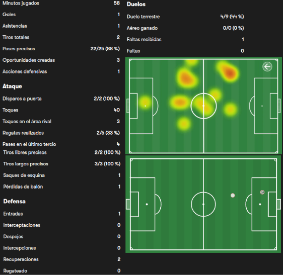 Además, tuvo un xG de 0.19 y un xA de 0.23 según 365scores.