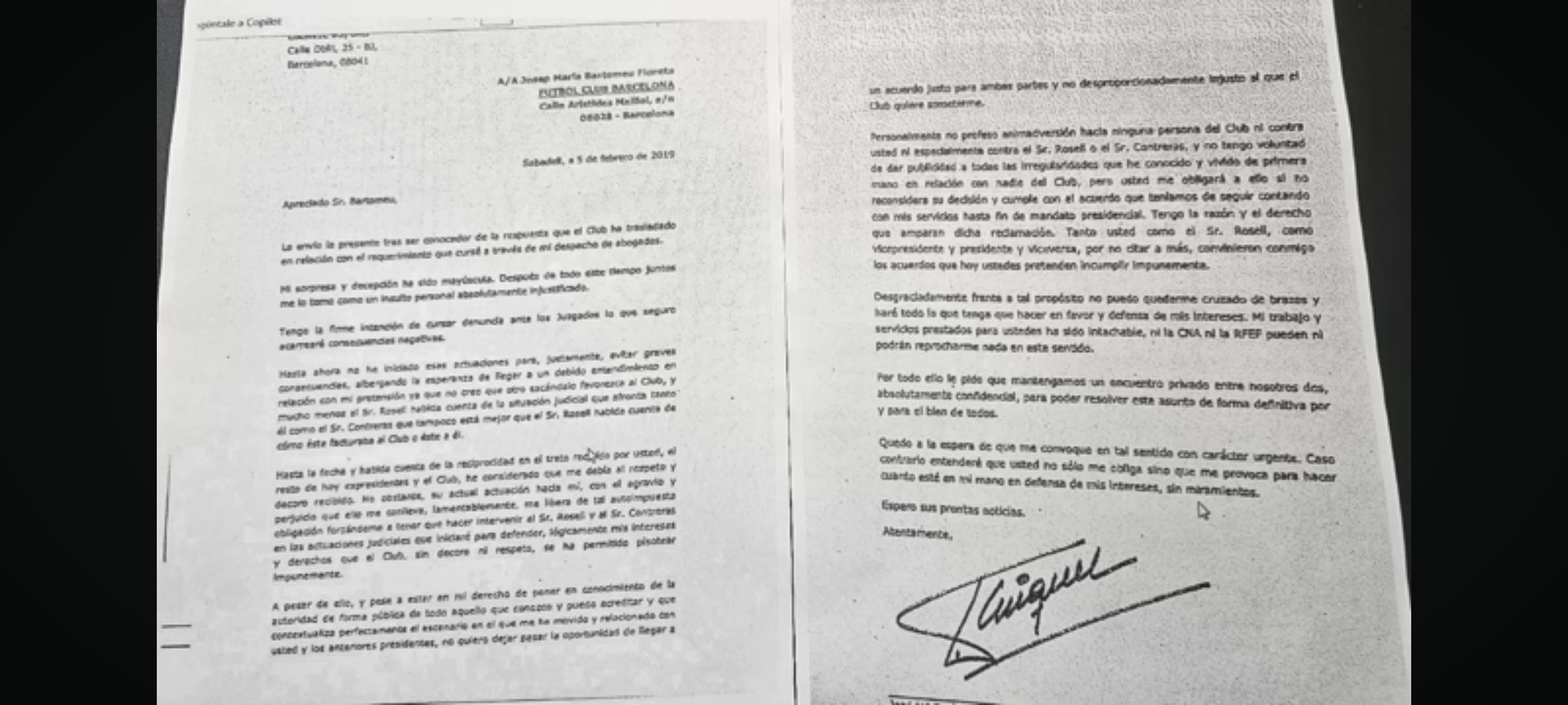 «A pesar de ello, y pese a estar en mi derecho de poner en conocimiento de la autoridad de forma pública de todo aquello que conozco y puedo acreditar y que contextualiza perfectamente el escenario en el que me he movido y relacionado con usted, no quiero dejar pasar la oportunidad de llegar a un acuerdo justo para ambas partes y no desproporcionadamente injusto al que el Club quiere someterme. Personalmente no profeso animadversión hacía ninguna persona del Club ni contra usted ni especialmente contra el señor Rosell o el señor Contreras, y no tengo voluntad de dar publicidad de todas las irregularidades que he conocido y vivido de primera mano en relación con nadie del Club pero usted me obligará a ello si no reconsidera su decisión y cumple con el acuerdo que teníamos de seguir contando con mis servicios hasta fin de mandato presidencial. Tengo la razón y el derecho que amparan dicha reclamación. Tanto usted cómo el señor Rosell, como presidente y vicepresidente y viceversa, por no citar a más, convinieron conmigo los acuerdos que hoy pretenden incumplir impunemente».