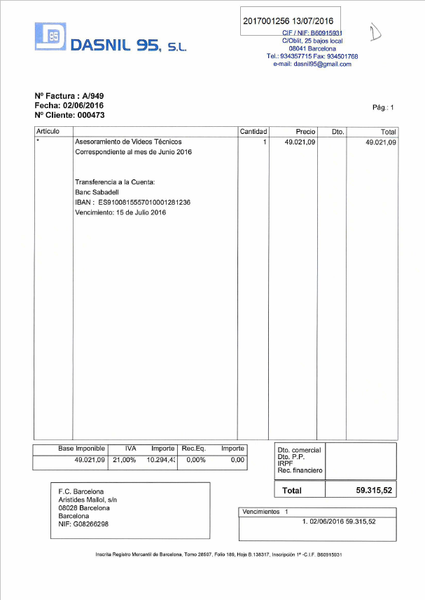 La Defensa del Barcelona se basa en que los servicios por los que pagaban a Dasnil 95 y Nilsad era el de asesoramiento técnico (luego voy a ello)