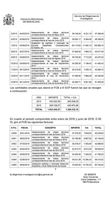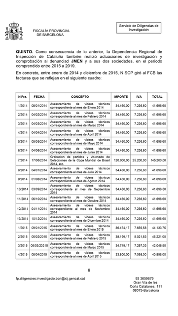 Y esto es un documento de la Fiscalía de Barcelona donde se detallan todas las facturas que giraron Dasnil y Nilsad (las empresas de Negreira) al Barcelona de 2014 a 2016.