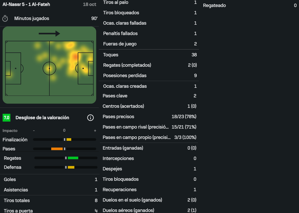 Además, tuvo un xG de 1.27, un xA de 0.03 y 1 recuperación.
