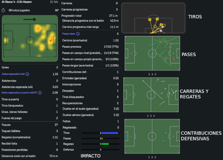 - Supera los 110 goles generados en la Liga Saudí, llegando a 111 (94G + 17A).