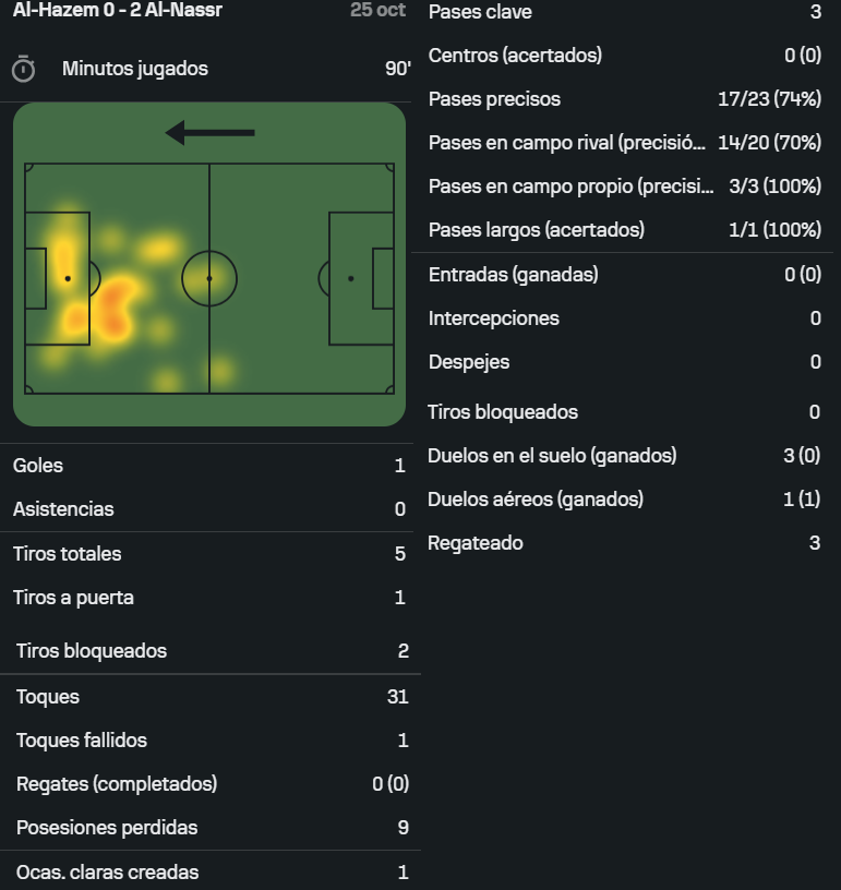 Además, tuvo un xG de 0.33, un xA de 0.4 y 1 recuperación.