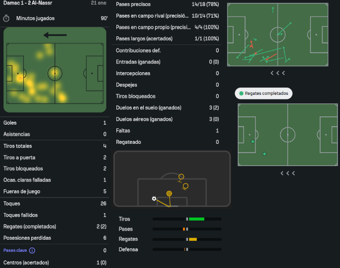 - Primera vez que hace 2+ regates en un partido desde el 14 de septiembre pasado contra Al-Kholood.