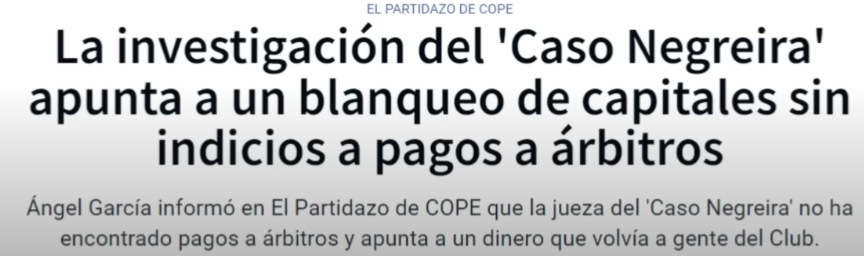 El que esta enganchado es Negreira por no declarar ingresos por los retiros de las empresas. En el Barcelona el dinero esta todo declarado, ahora, si Negreira, en mandato del Barcelona, usaba ese dinero para acciones delictivas o para arreglos deportivos, ahi esta el tema a probar.